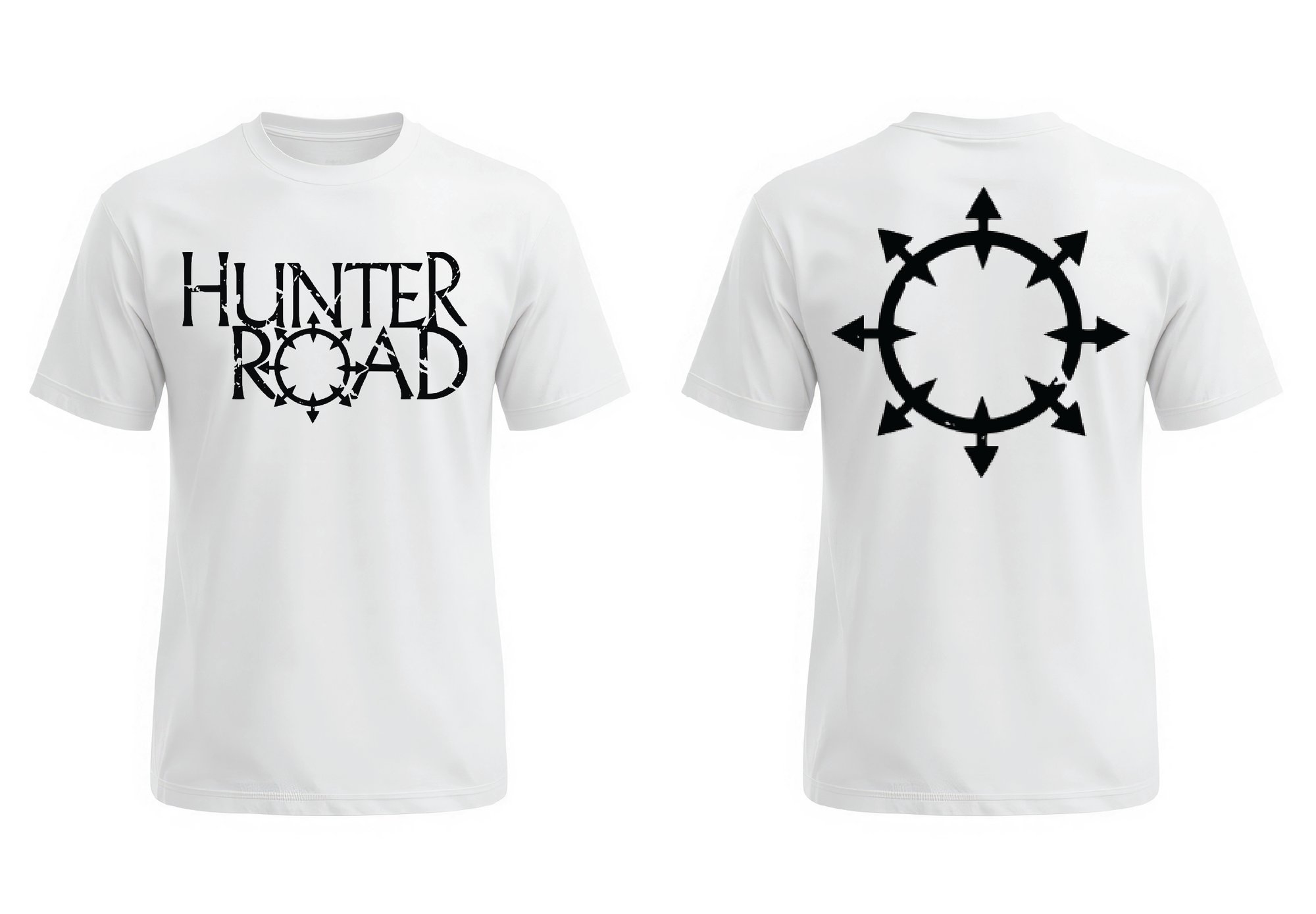 White T-shirts with printed 'Hunter Road' logo on the front and chaos "O' on the back.