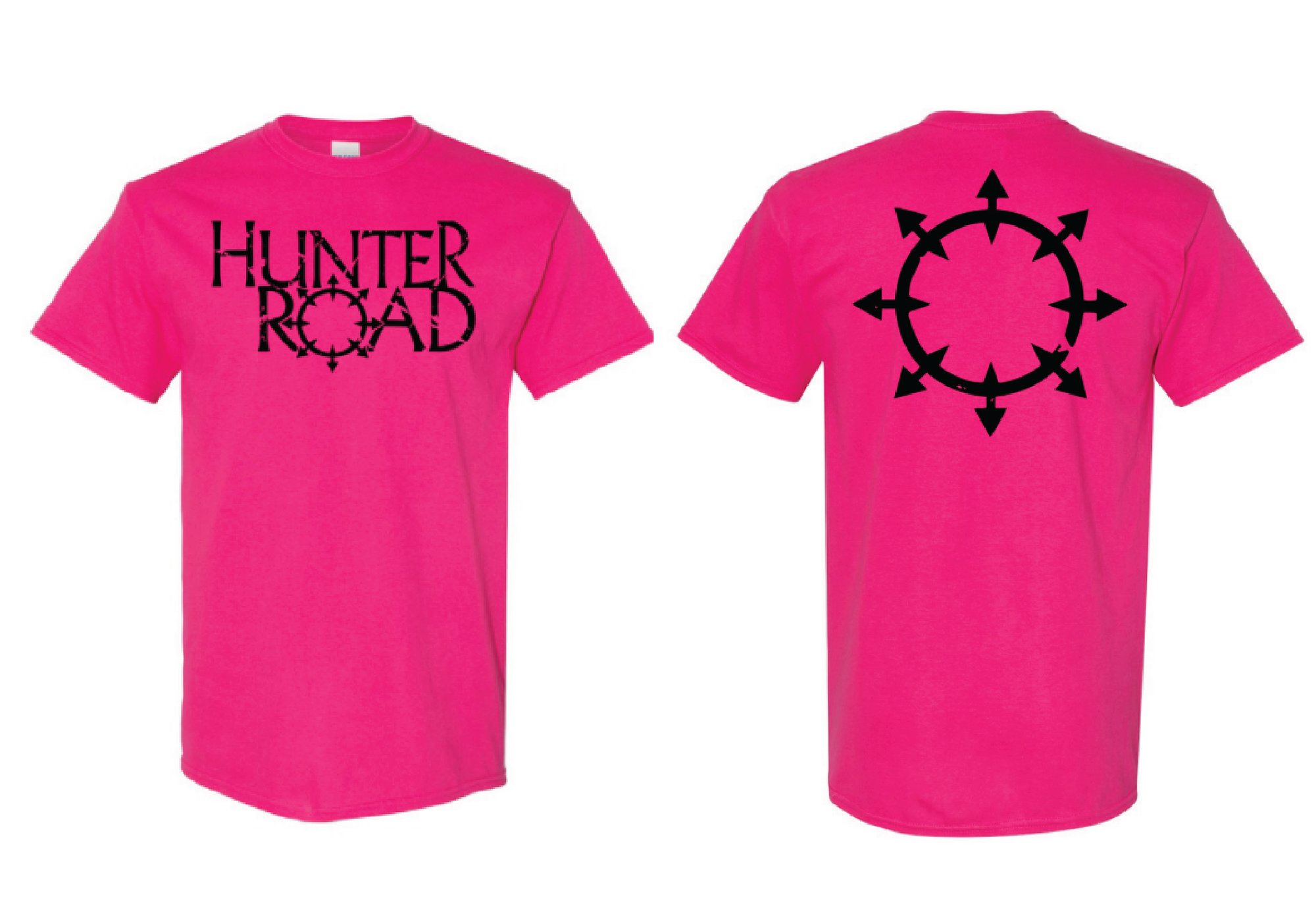 Pink T-shirts with printed 'Hunter Road' logo on the front and chaos "O' on the back.